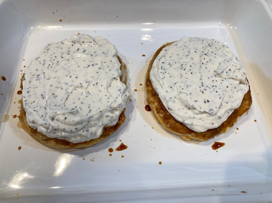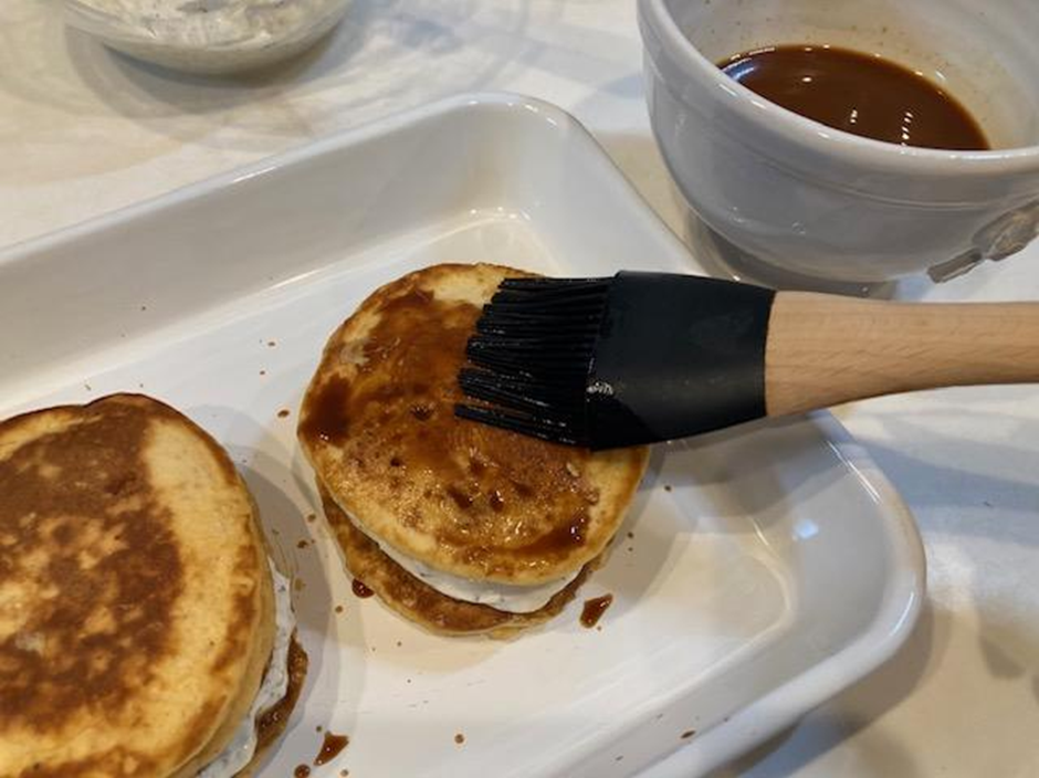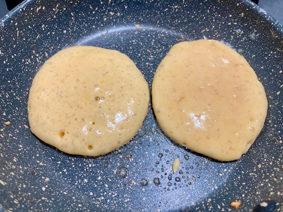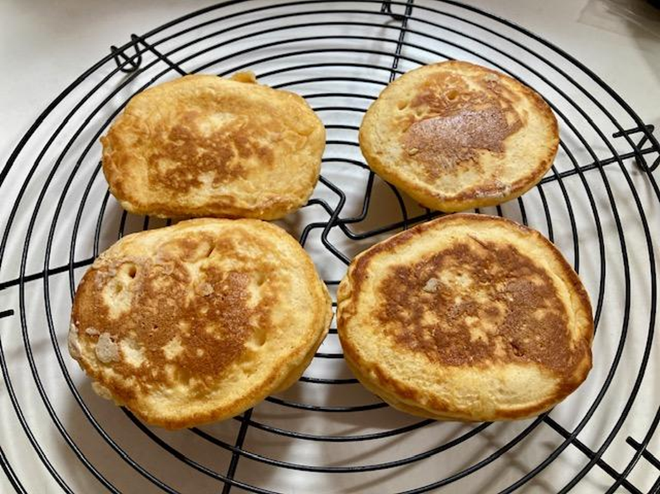 ➂市販のホットケーキミックスで生地をつくり、小さめのパンケーキを4枚(または6枚)焼く。両面に焼いたら冷ましておく。