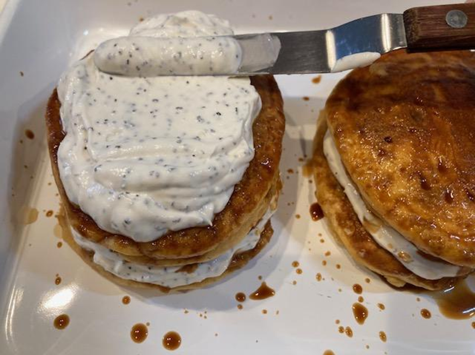 さらにもう1枚のパンケーキをのせ、チョコレートシロップ、オレンジクリームを塗る。
