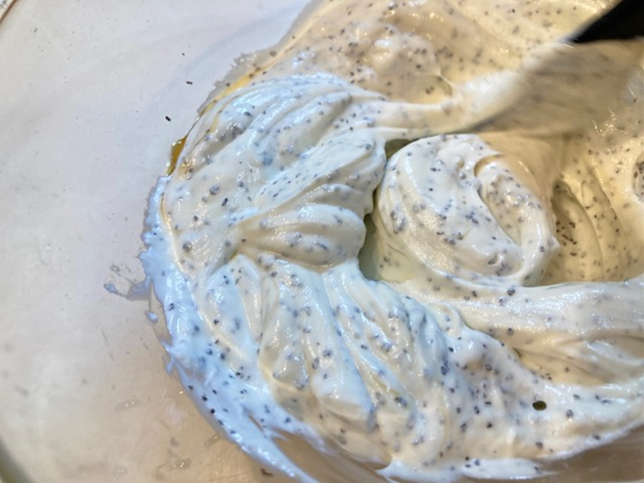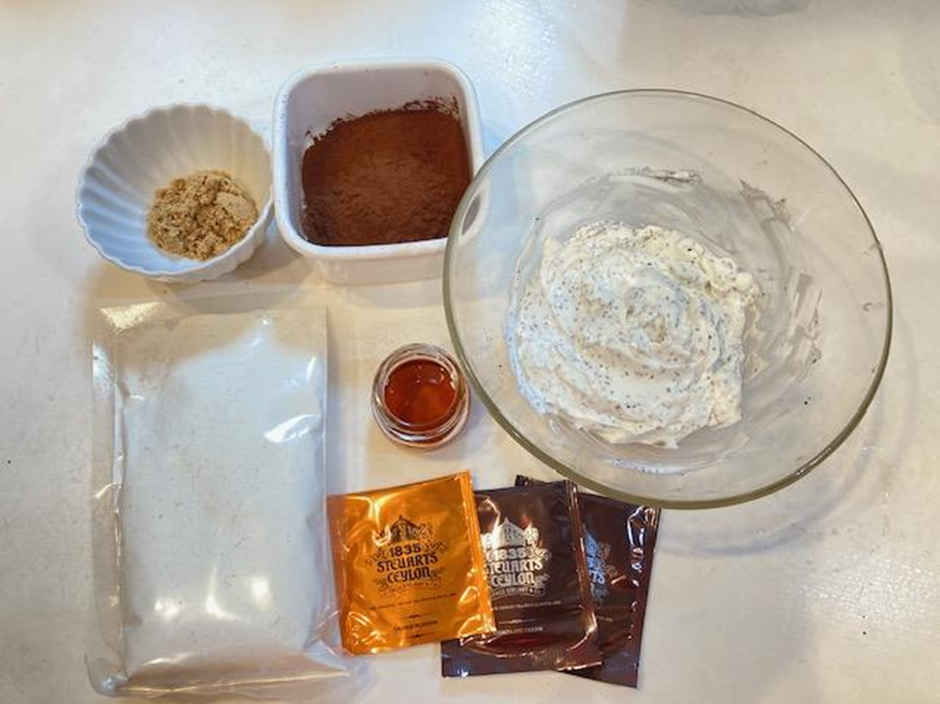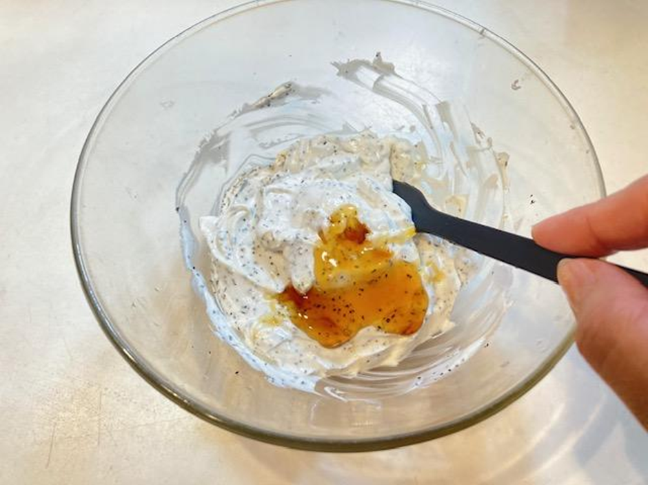 ➁水切りヨーグルトを別のボウルに入れ、はちみつ、砂糖、ティーバッグ(オレンジブロッサム)を加えて混ぜる。冷蔵庫に入れておく。