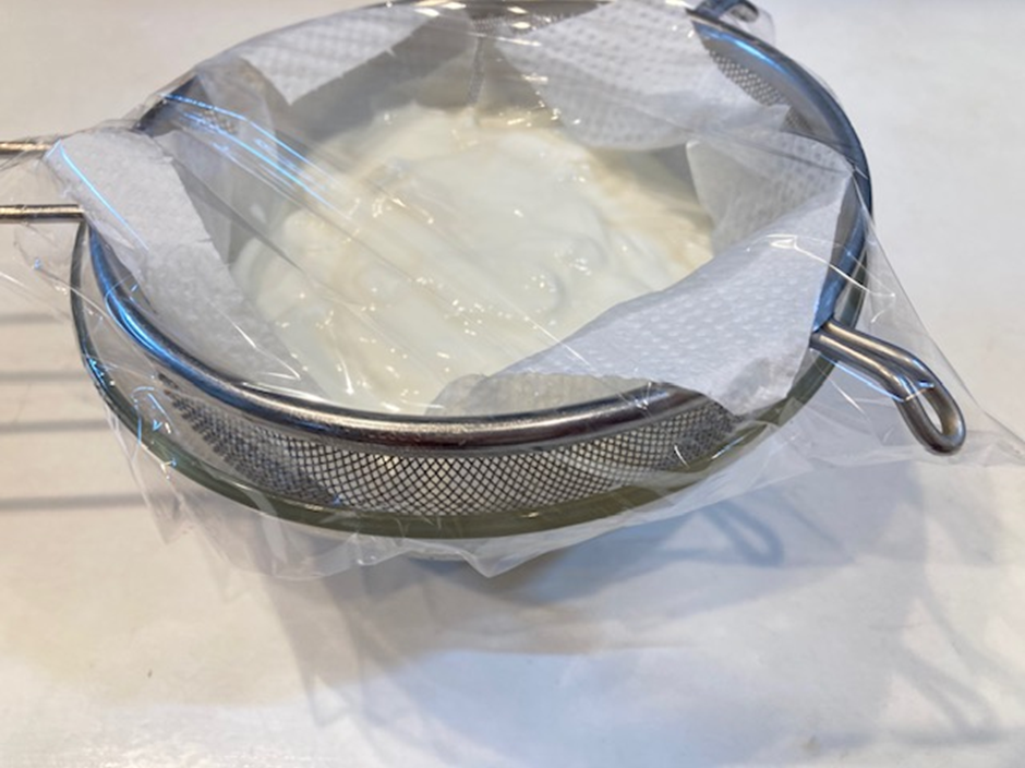 ①ボウルにザルを重ね、キッチンペーパーを敷き、ヨーグルト400g(1箱分)を入れる。ラップをして、冷蔵庫で一晩置く。時々ボウルに溜まった水を捨てる。