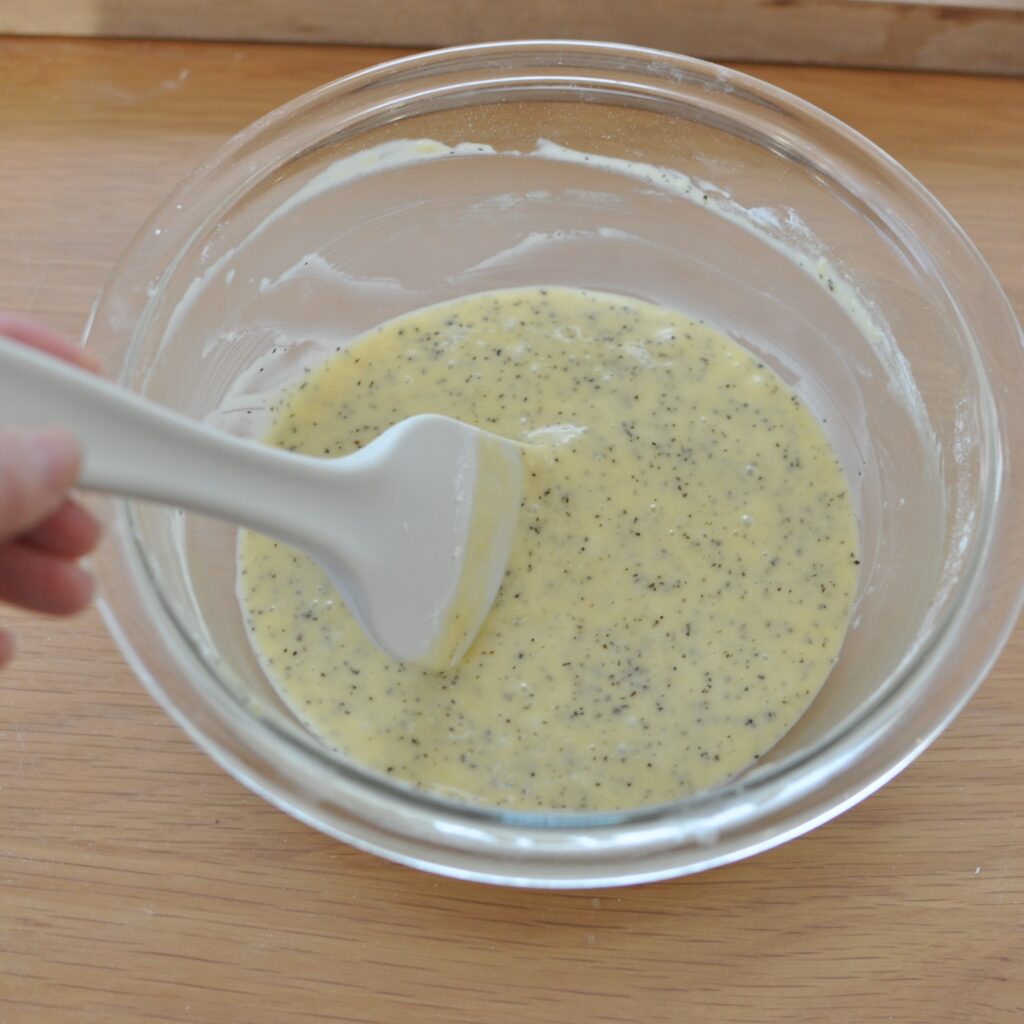 ③薄力粉とベーキングパウダーを合わせて、ふるい入れ、ゴムベラで混ぜる。