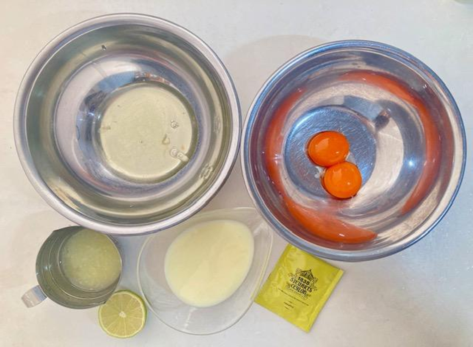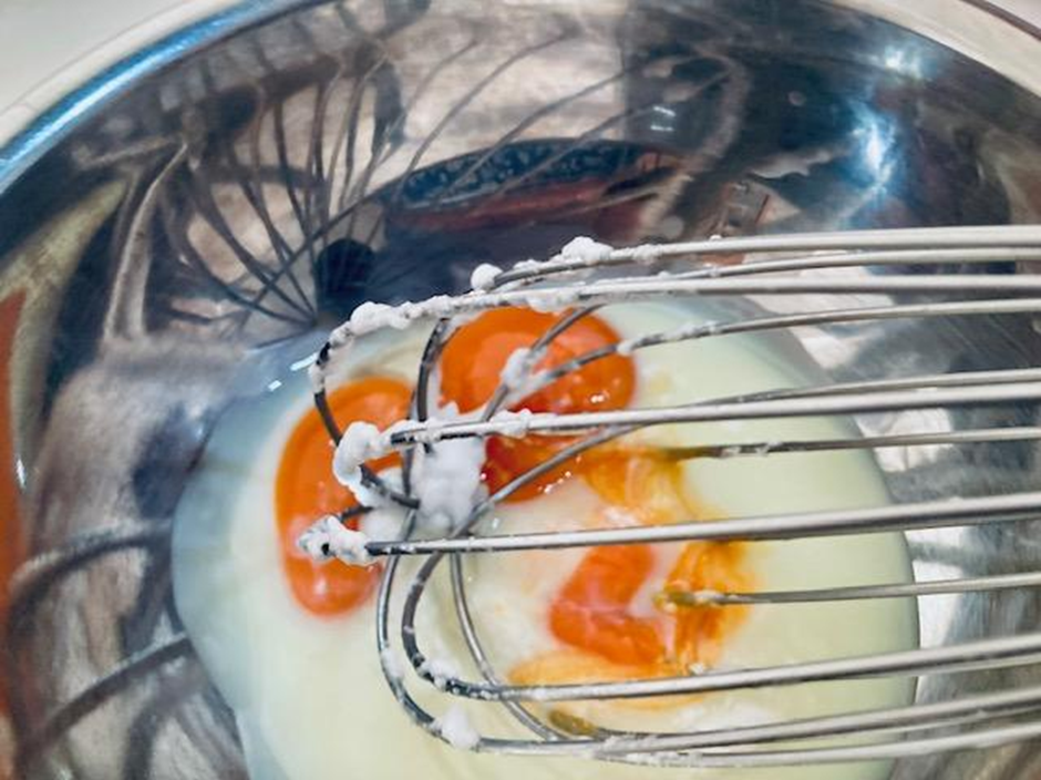 ② 別のボウルに卵黄とコンデンスミルクを合わせ、①のホイッパ―で混ぜる。