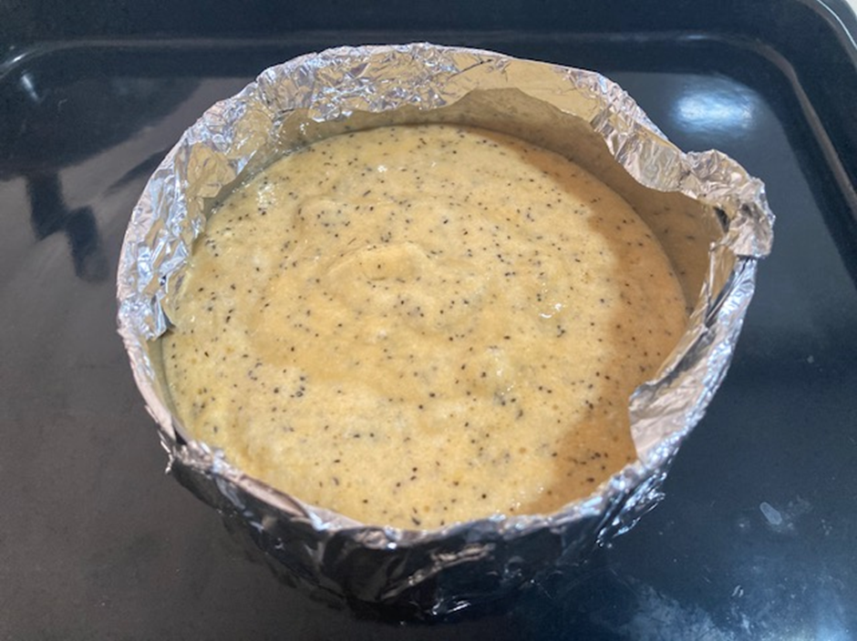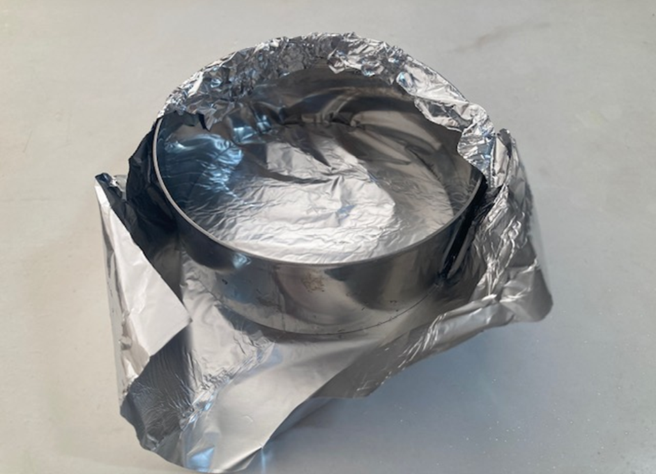 ④アルミホイルを巻いたセルクルに➂の生地を注ぎ、170度のオーブンで20分焼く。
