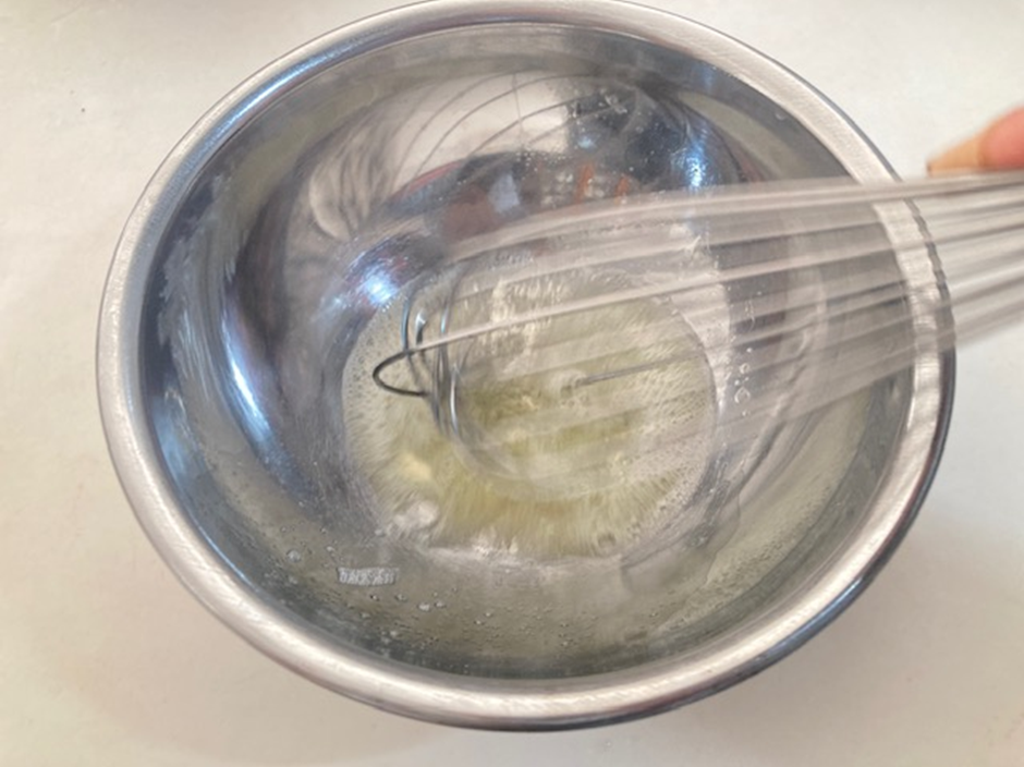 ①ボウルに卵白を入れしっかりめに泡立てる(卵白を掬ったときに角が立つ程度)。