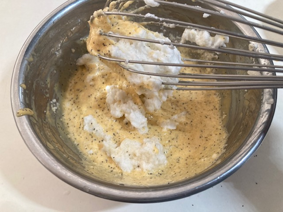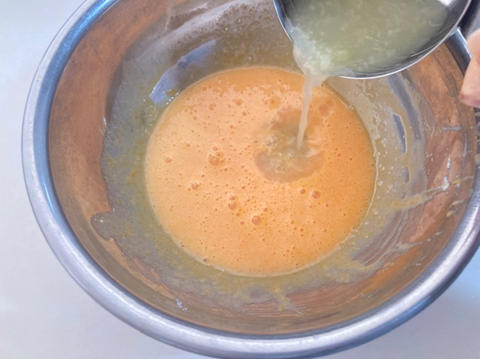 ③ ①の泡立てた卵白を2,3回に分けて加え混ぜる。泡をつぶさないようにおおまかに混ぜる。