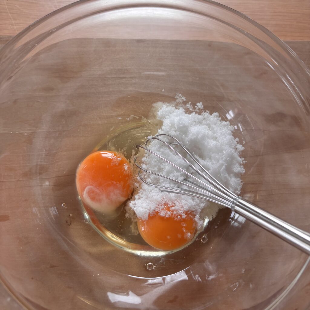 ② ボウルに卵を割り、砂糖を入れてよく混ぜ、濾してプリン液を作る。